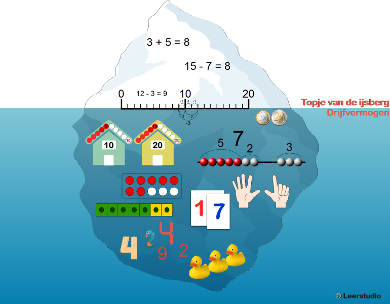 Om goed te kunnen rekenen hebben kinderen veel kennis en vaardigheden nodig. Rekenmoeilijkheden zijn meestal te wijten aan het ontbreken van de onderliggende rekenvaardigheden. De aanpak van het ijsbergrekenen sluit nauw aan bij de basisprincipes van de rekendidactiek: van concreet, over schematisch (met een tekening) naar het abstracte formele ‘rekenen’ met getallen. Met de materialen en spelvormen van het ijsbergconcept maken we wiskunde voor àlle kinderen aanschouwelijk en aantrekkelijk. Niet enkel als het kind het niét begrijpt.”