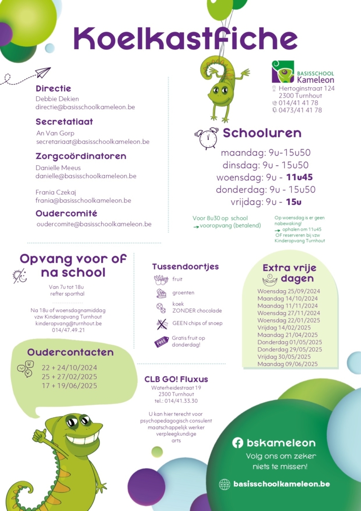 Alle praktische info op 1 handig blad om, bijvoorbeeld, aan je koelkast te hangen.